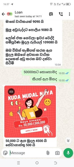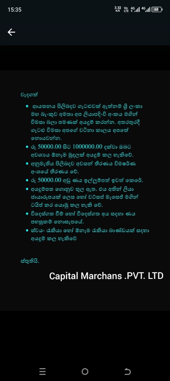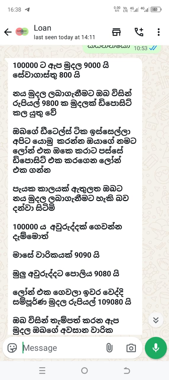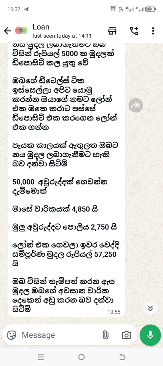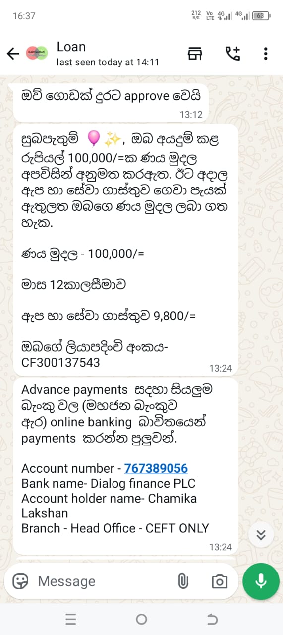 අනේ මට උදව් කරන්න.මම ඇප් වලින් loan අරන් ගොඩක් හිරවෙලා ඉන්නෙ.මට අසනීපවෙලා ඉන්නෙ. +94 76 440 0387 ඊයෙ මේකෙන් whats app තියනපහත දාල තියන පොටෝවල තියන ආයතනයකට මම අවුරුද්දක් ගෙවන් යන්න කියල සීදුව පැත්තෙ කියල මහබැංකුවෙ රෙජිස්ටර් කියල සහතික පවා තිබුන නිසා ඩිපොසිට් එකක් කරා ඇතමාරුවක් කරගෙන ඒක කරෙත්.උන් හොරු.කෙල්ලෙක් comment කරල තිබුන ලක්ෂ 2 ගත්ත ගෙවන්න කියල.මම ඒ නිසයි බැලුවෙ.දැන් whats app block.norml cll weda ansr na. මොකක්ද මෙහෙම වුන්ට කරන්නෙ? කවුරුත් අහුවෙන්නෙපා.